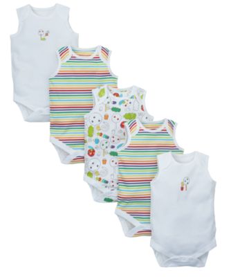 Featuring fun caterpillar prints, and bright and colourful stripe designs, these bodysuits have been made from 100% natural cotton to ensure they feel soft and comfortable on your baby's skin. The sleeveless design makes them ideal for your baby to wear on their own in hot weather, but they are also perfect for creating a layer for warmth underneath your little one's clothing in colder weather.