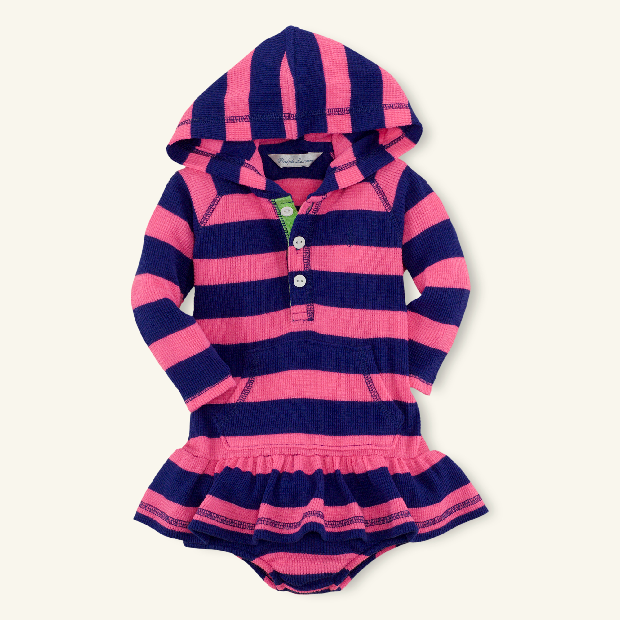 This cozy, hooded waffle-knit cotton dress comes in a fun striped pattern and features our signature embroidered pony and a matching bloomer.
