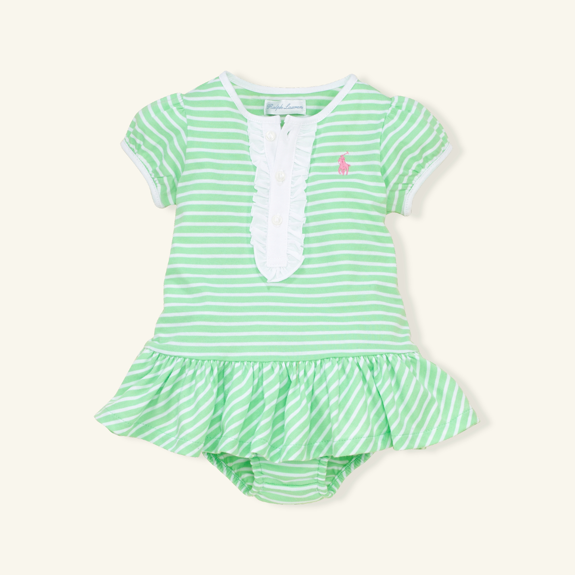 This preppy striped cotton dress is accented with charming ruffles and our signature embroidered pony.