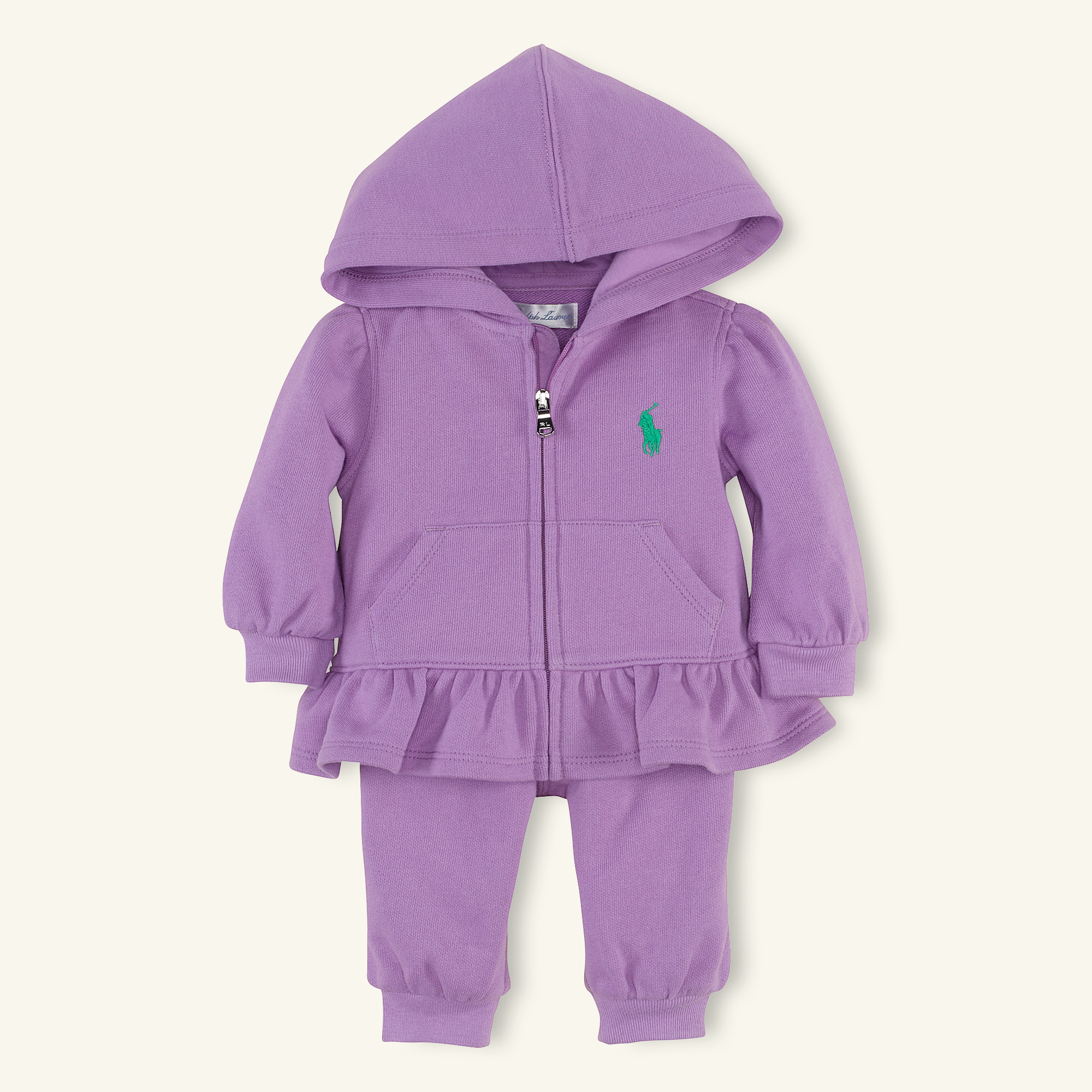This comfortable set features a charming hoodie and an athletic-inspired pant, both crafted from super-soft cotton terry.
